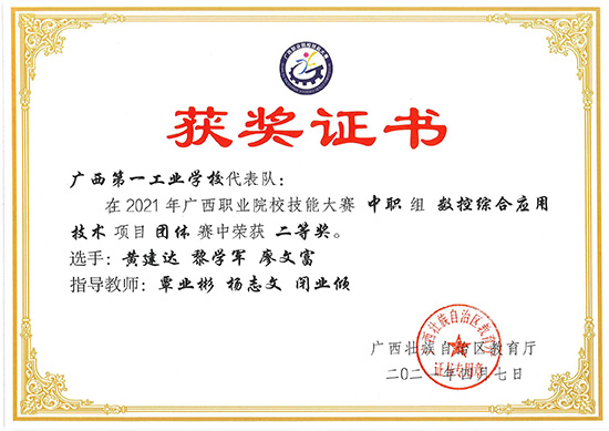 廖文富第46届世界技能大赛广西选拔赛,荣获数控铣项目二等奖