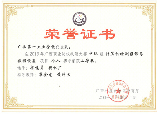梁健勇荣获计算机检测维修与数据恢复项目一等奖