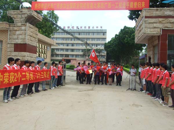 6月28日参赛代表队回到南宁,学校派出代表到南宁火车站迎接,并在学校大门举行了迎接仪式。劳副校长在迎接仪式上致辞,对本次比赛所获得的成绩给予高度赞扬,本次比赛实现了我校在国家级技能比赛中获奖新的突破。